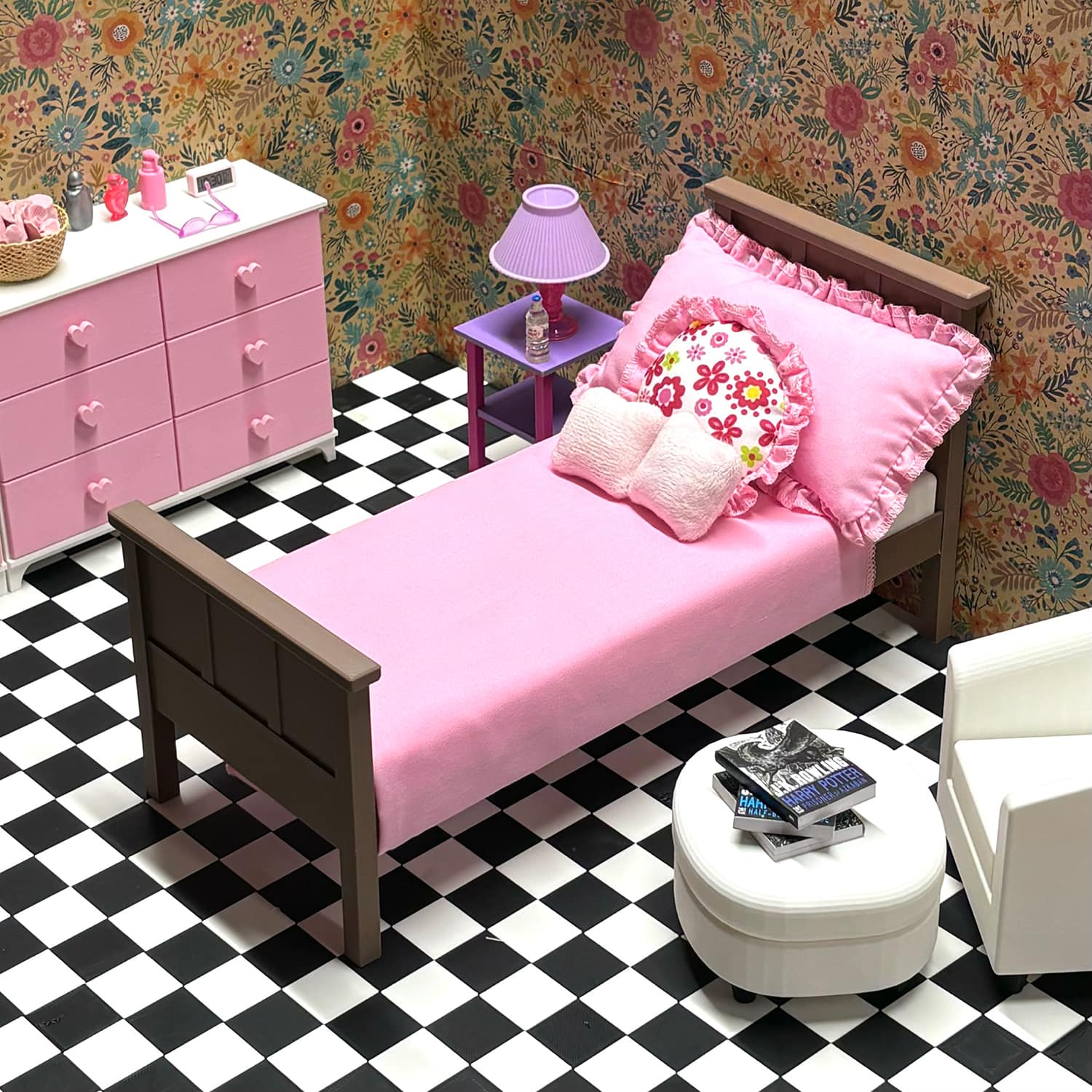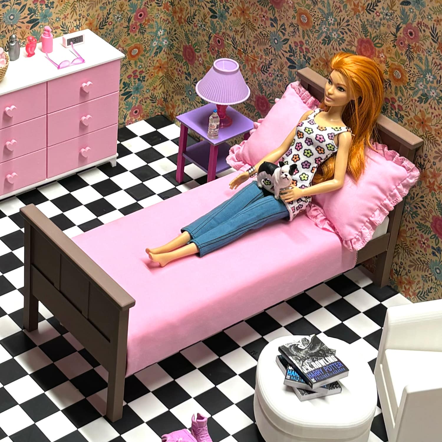 Barbie-size 3D printed bed, perfect for 11–12 inch fashion dolls, designed as modern dollhouse furniture in durable PLA plastic.