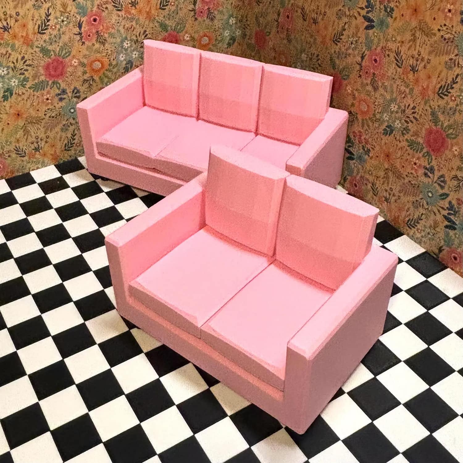 This handmade 3D printed PLA love seat is a charming, custom-scaled furniture piece designed specifically for Barbie-sized dolls in 1:6 scale, perfect for enhancing dollhouse living rooms or play scenes with a touch of personalized elegance.