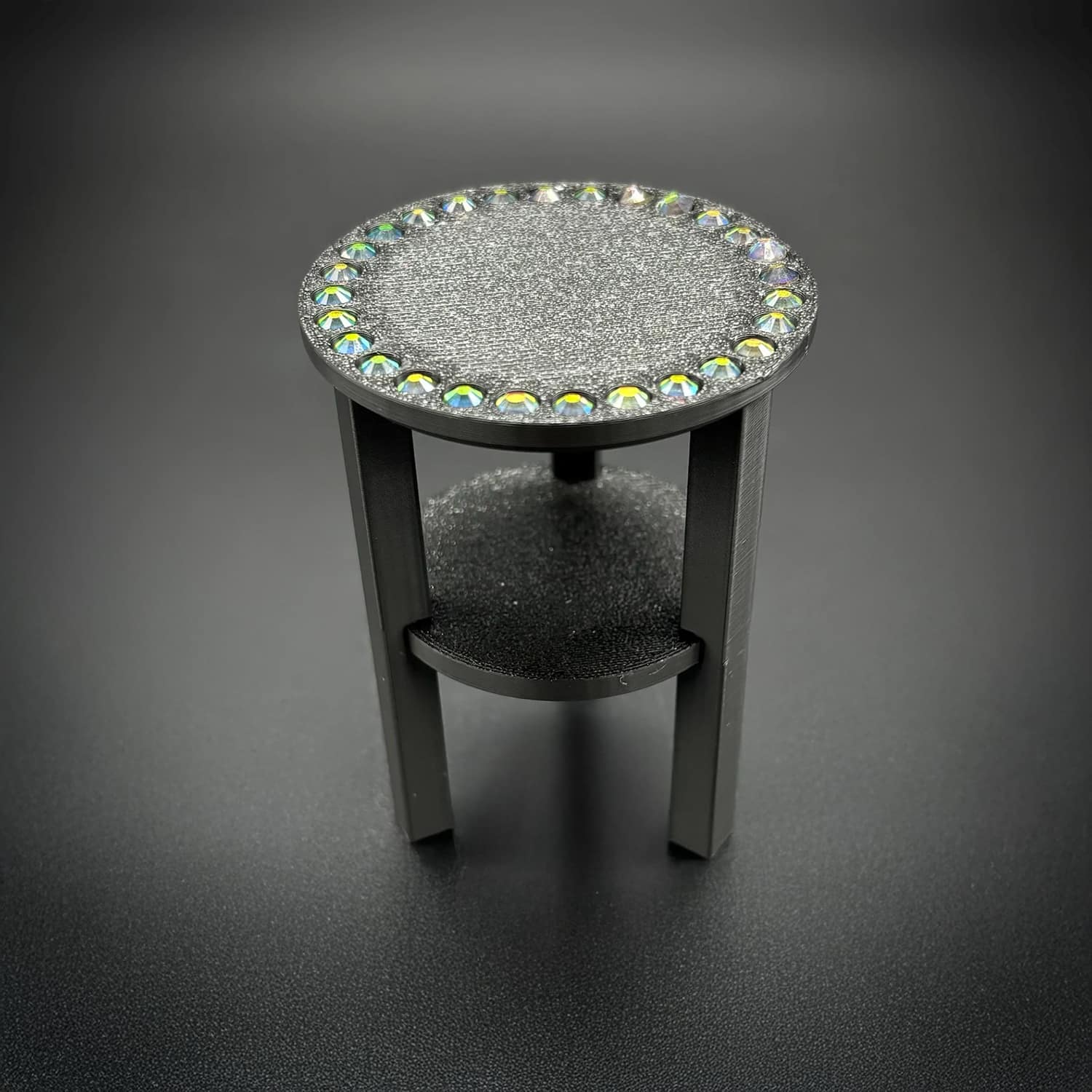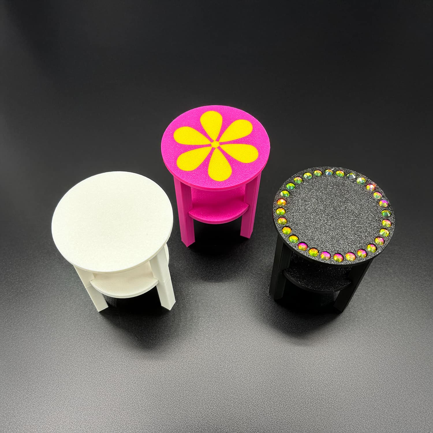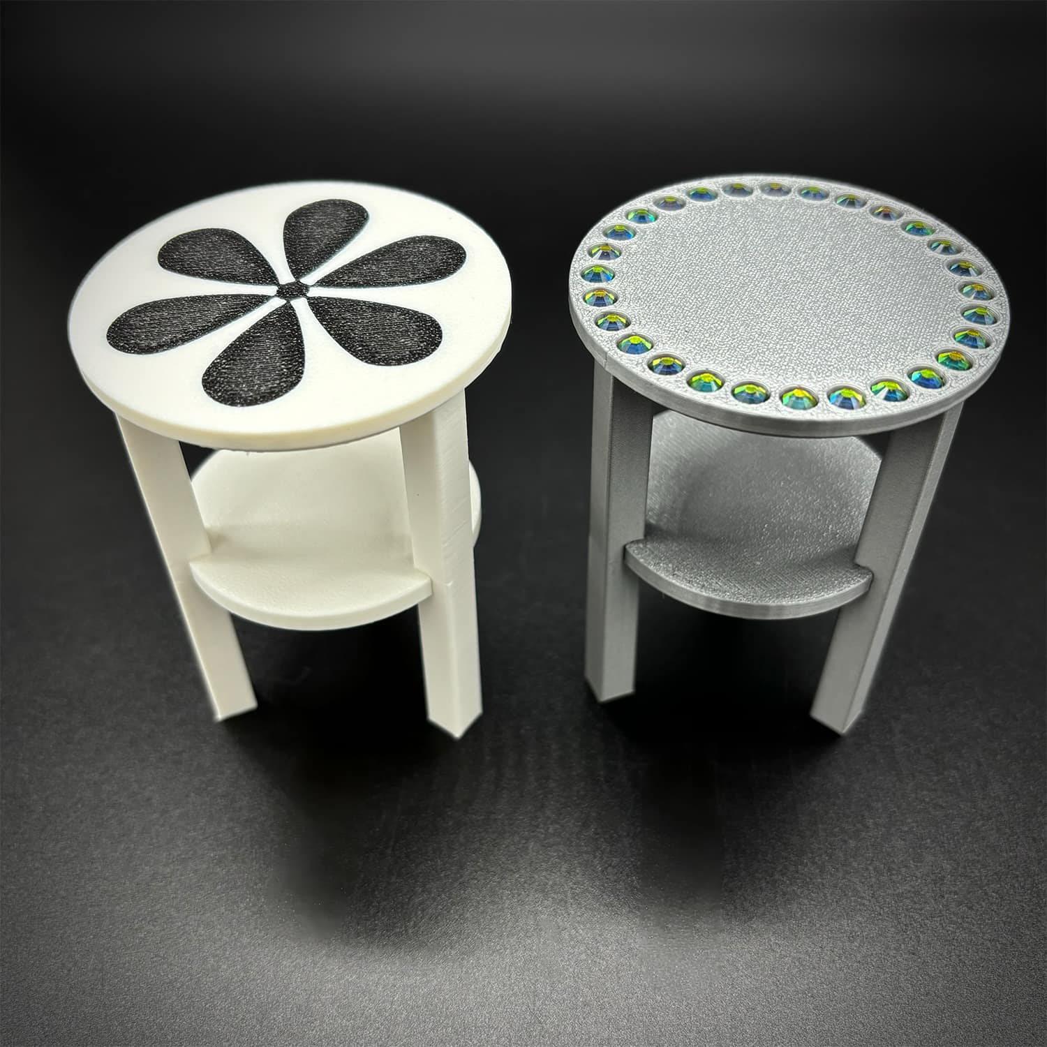 Barbie 3D–printed PLA round sparkle table at 1:6 scale, designed to fit Barbie-sized and other fashion dolls. This sparkle table features a smooth circular top embellished with inlaid rhinestones for added sparkle and glamour. The compact side-table proportions work well next to sofas, beds, or lounge chairs in dollhouses, making it an eye‑catching accent piece without overpowering the scene.