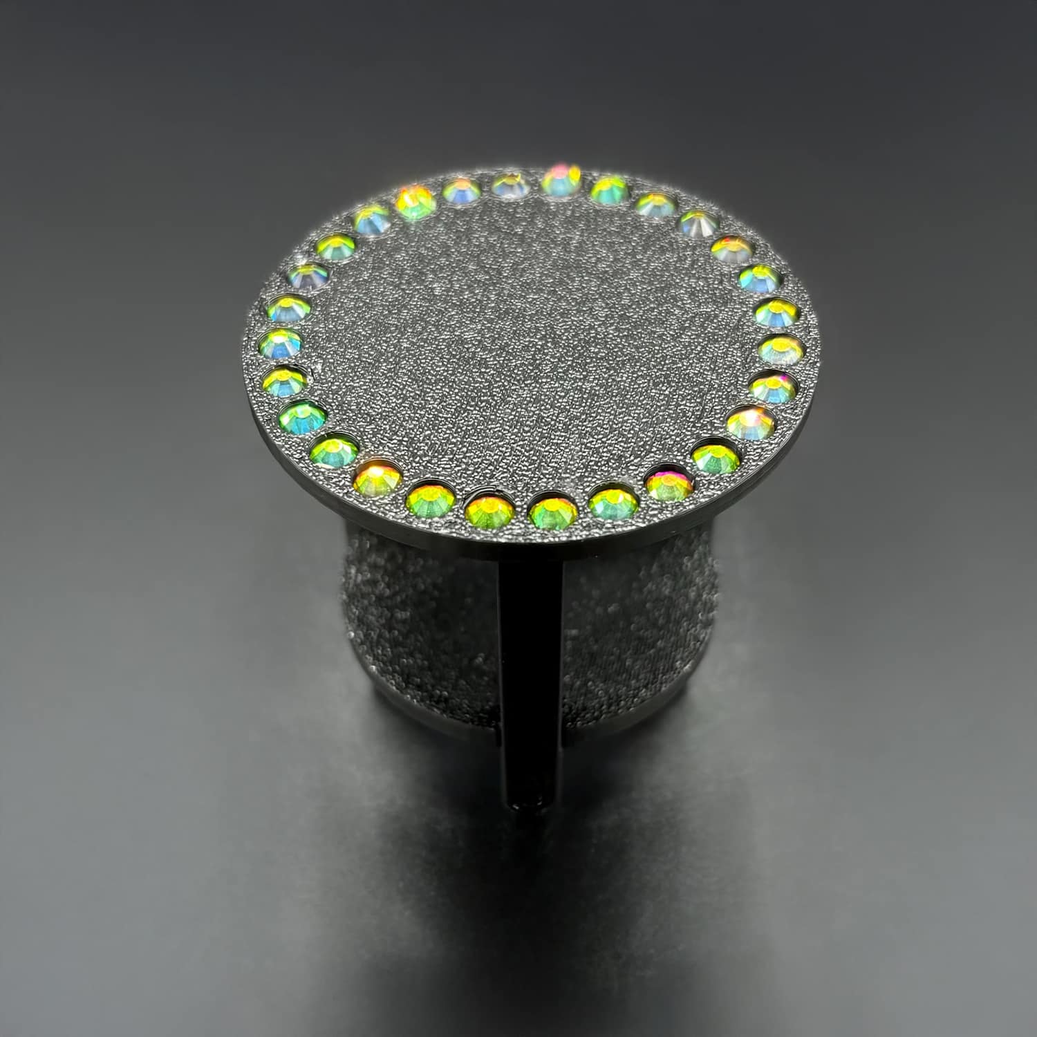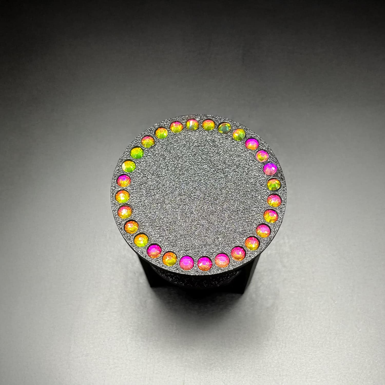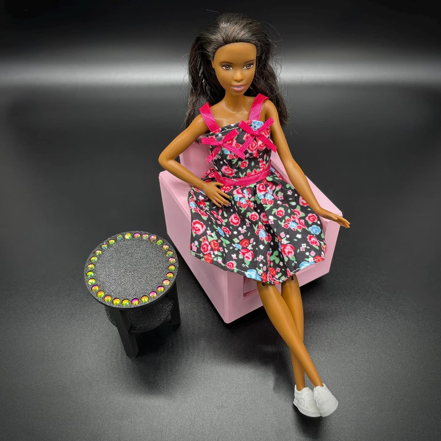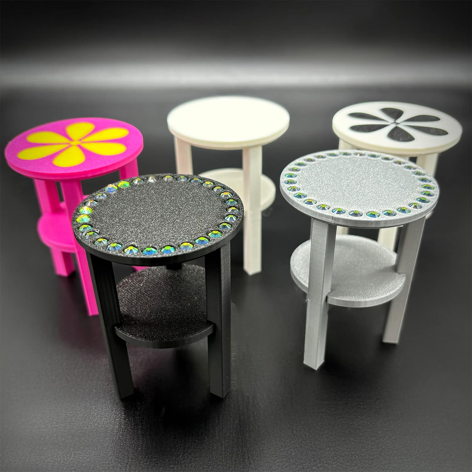 Barbie 3D–printed PLA round sparkle table at 1:6 scale, designed to fit Barbie-sized and other fashion dolls. This sparkle table features a smooth circular top embellished with inlaid rhinestones for added sparkle and glamour. The compact side-table proportions work well next to sofas, beds, or lounge chairs in dollhouses, making it an eye‑catching accent piece without overpowering the scene.