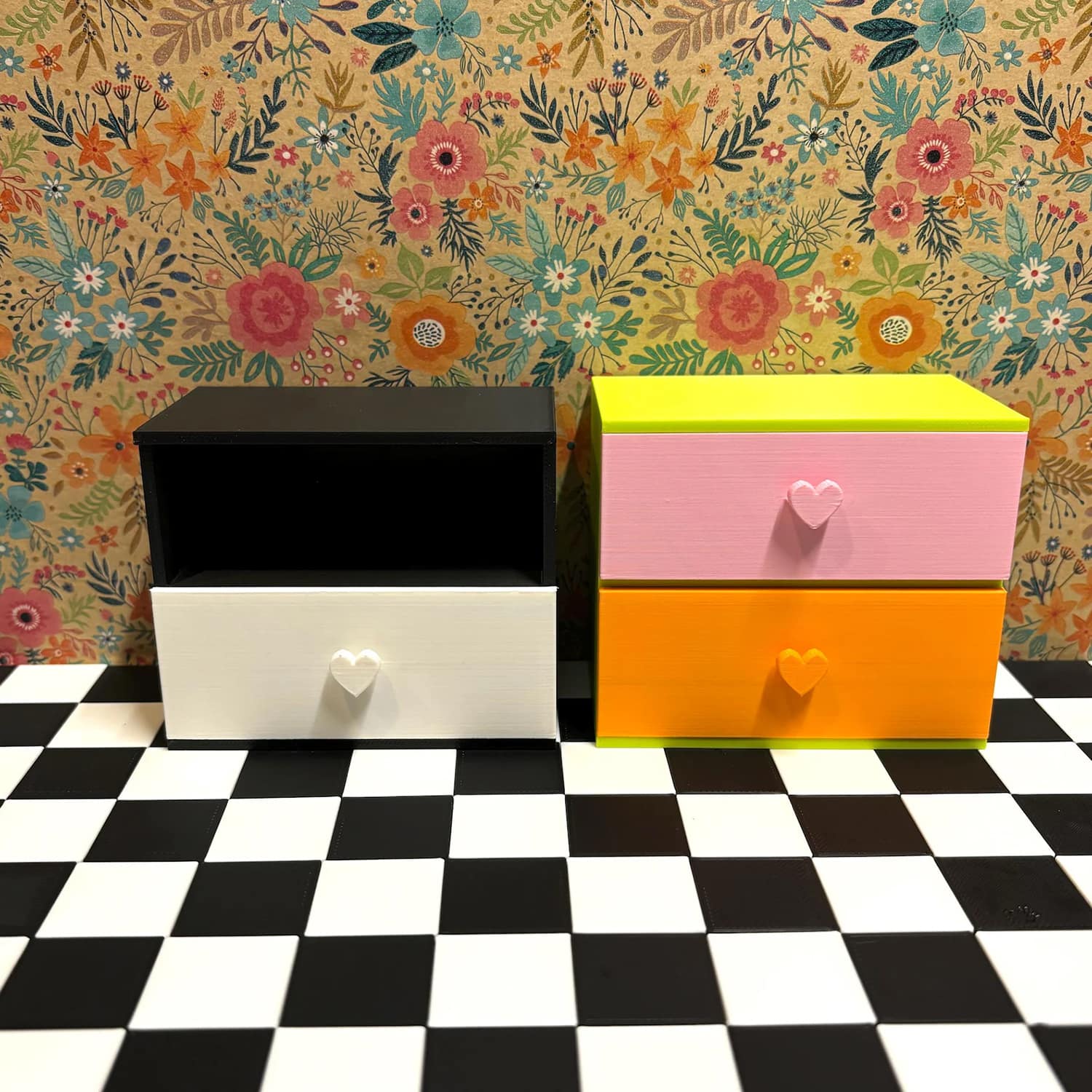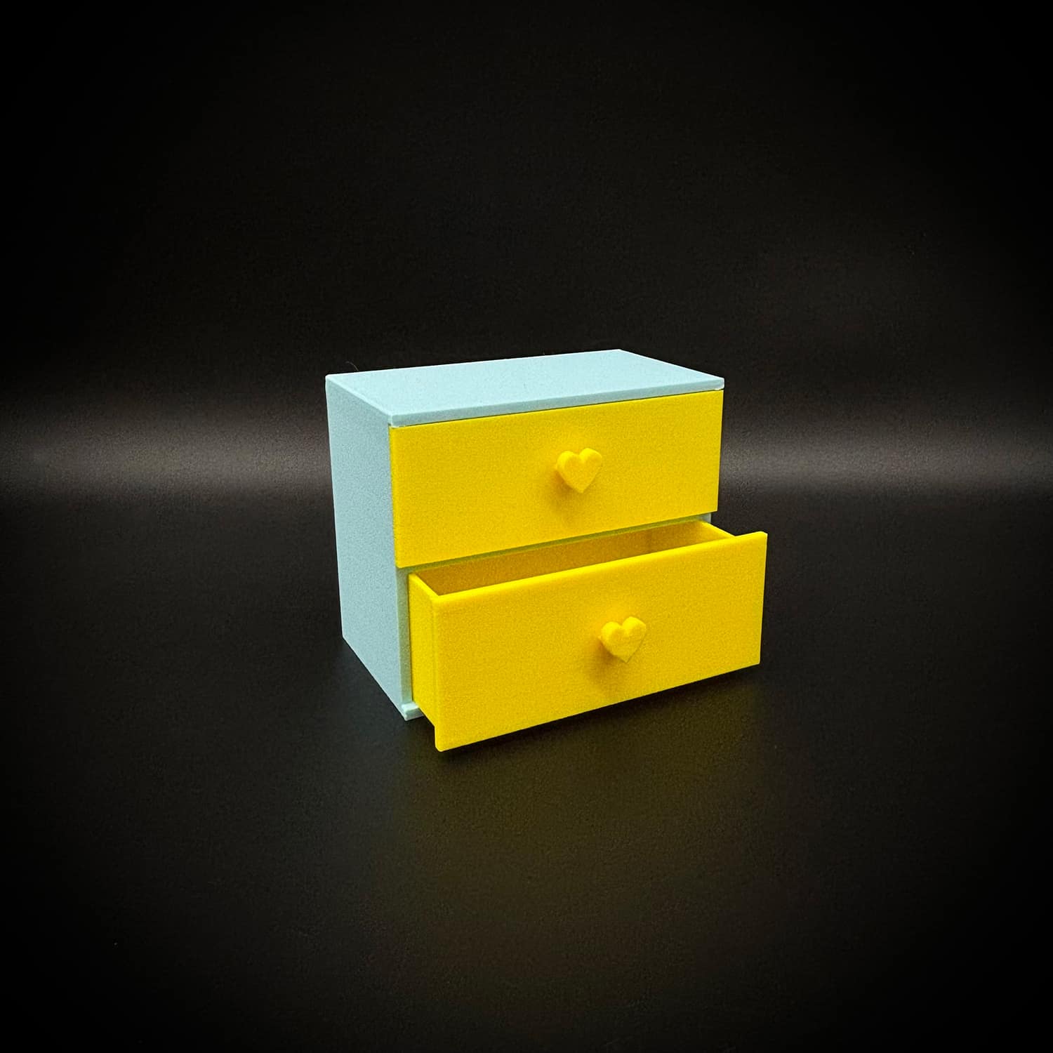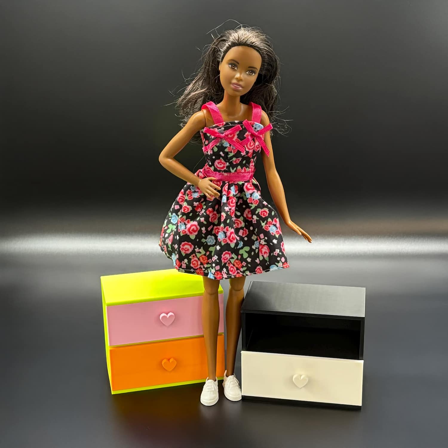 Two functional small drawers with heart pulls are designed for easy open/close action; no flimsy assembly required as it’s fully printed as one solid unit. Kids love filling the spacious drawers with their Barbie-sized wardrobe for imaginative role-play, while collectors appreciate the display-ready design that elevates 1:6 scale setups. Pair it with a matching bed or vanity for a complete bedroom scene—it’s versatile for modern, vintage, or fantasy Barbie-sized worlds.