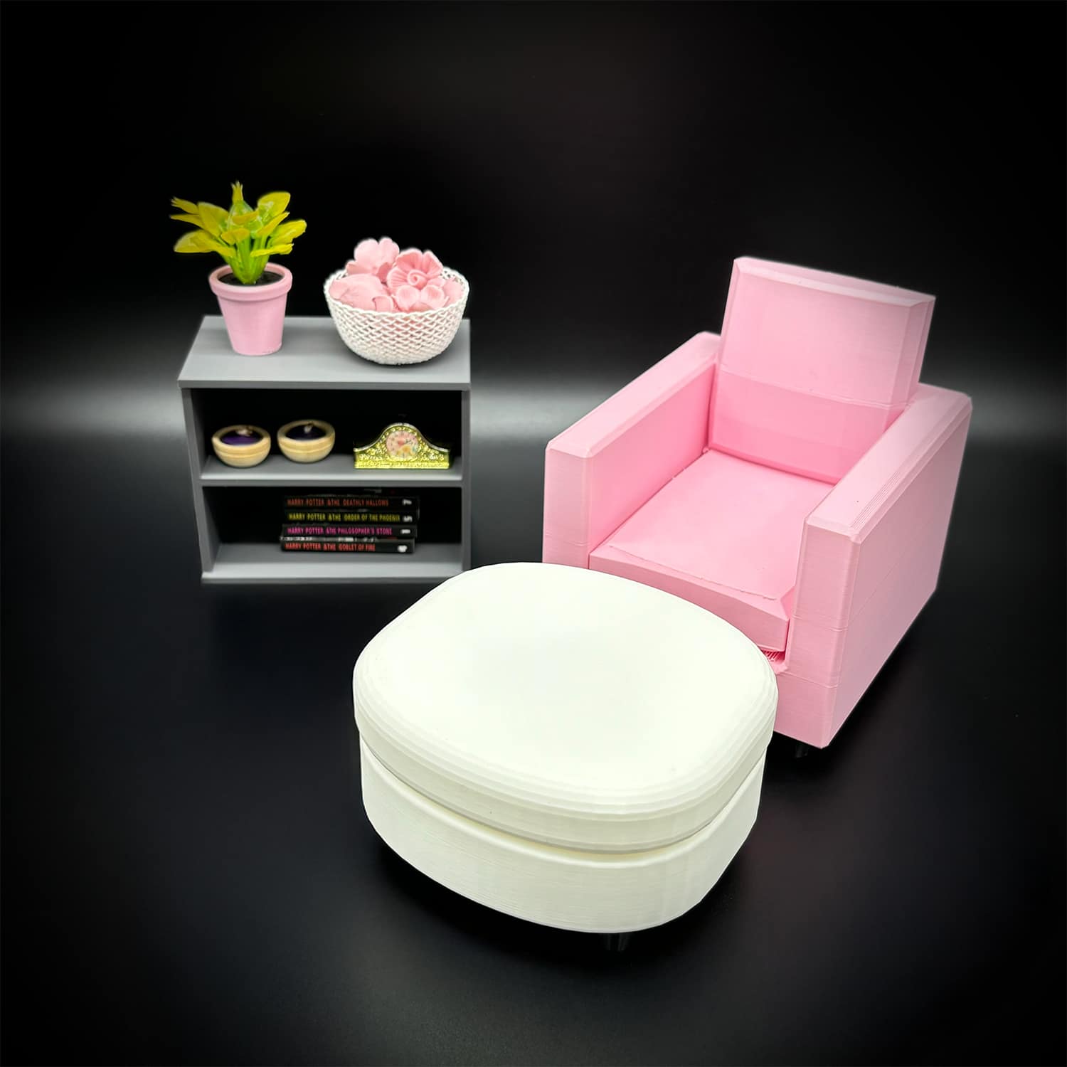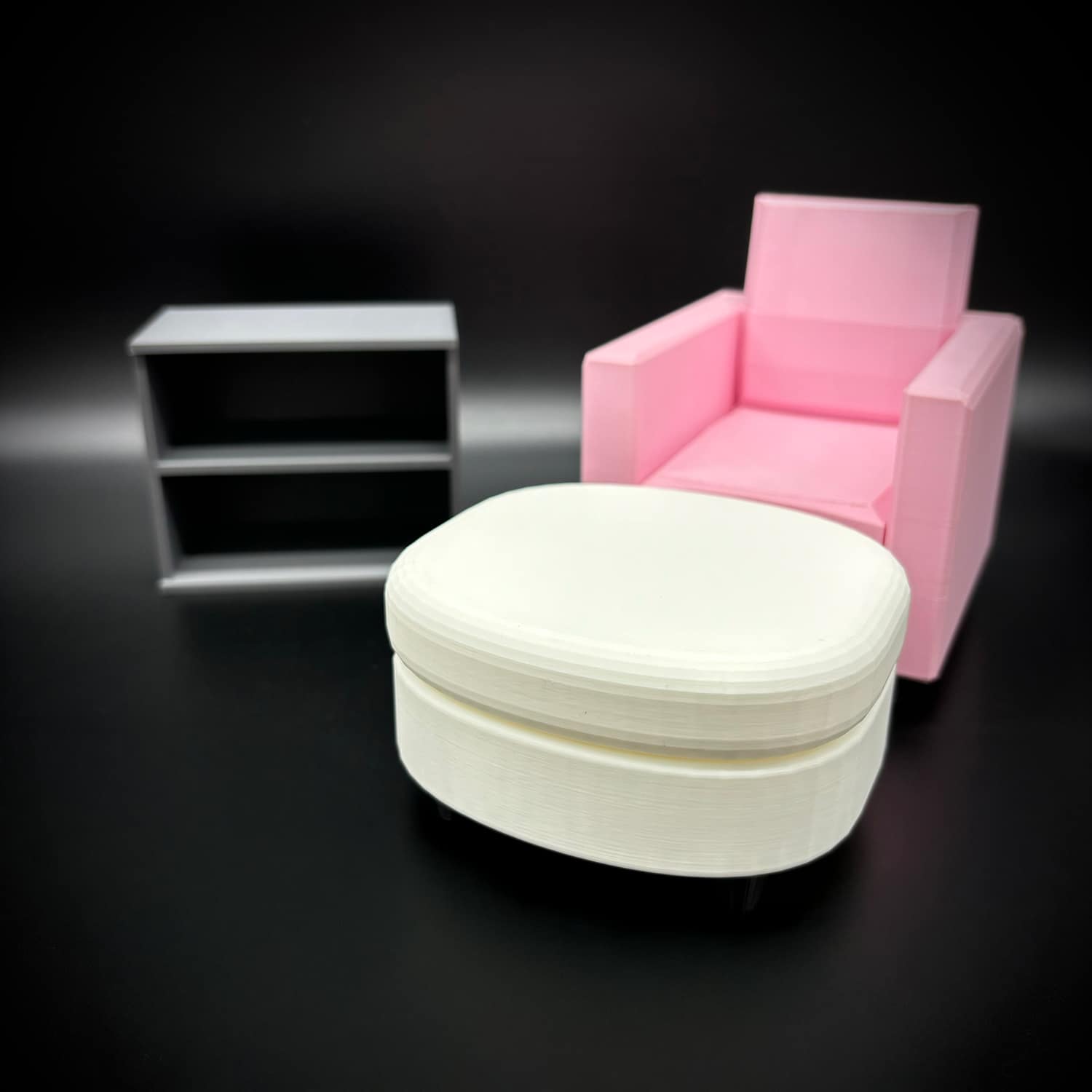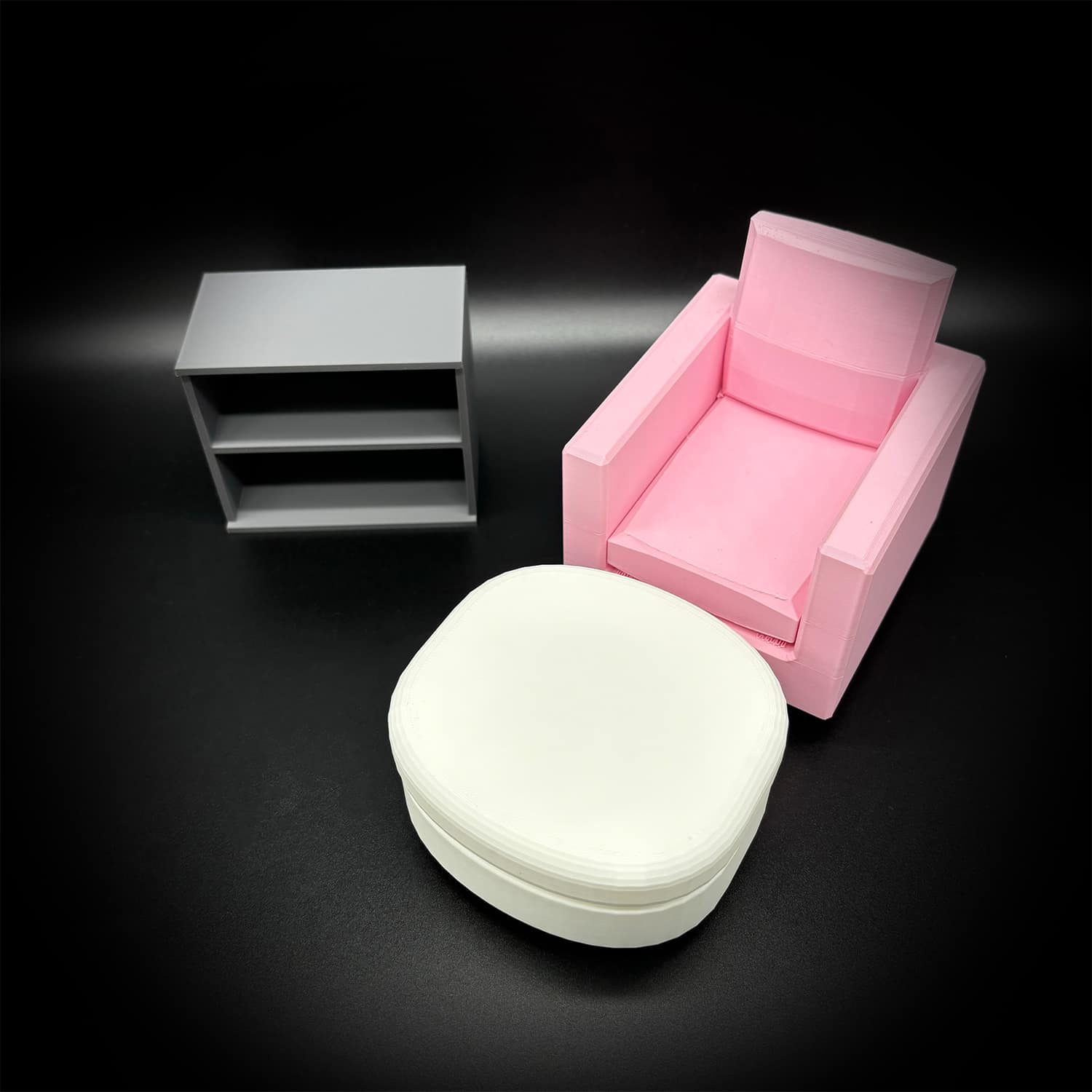 This set of small shelves features a sleek, minimalist design with two spacious shelves, perfect for displaying tiny accessories, books, or collectibles in a dollhouse setup. Crafted via high-quality 3D printing using durable PLA filament, it offers customizable colors to match any theme. Think soft pastels for kids’ playrooms or sophisticated neutrals like matte black or wood-grain tones for adult collectors’ displays. Generous shelf depth accommodates small items like mini purses, shoes, or modular storage bins without tipping. Kids love its playful sturdiness for imaginative play, while adult collectors appreciate the custom quality for elevating displays alongside other miniatures.