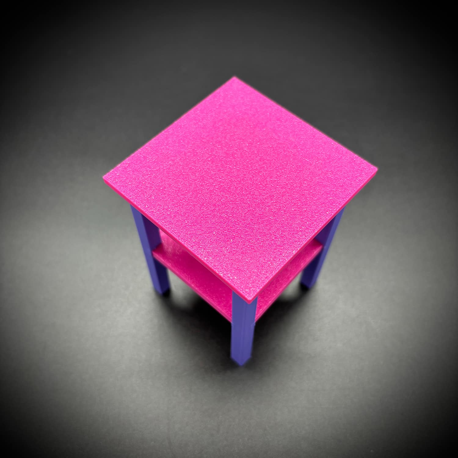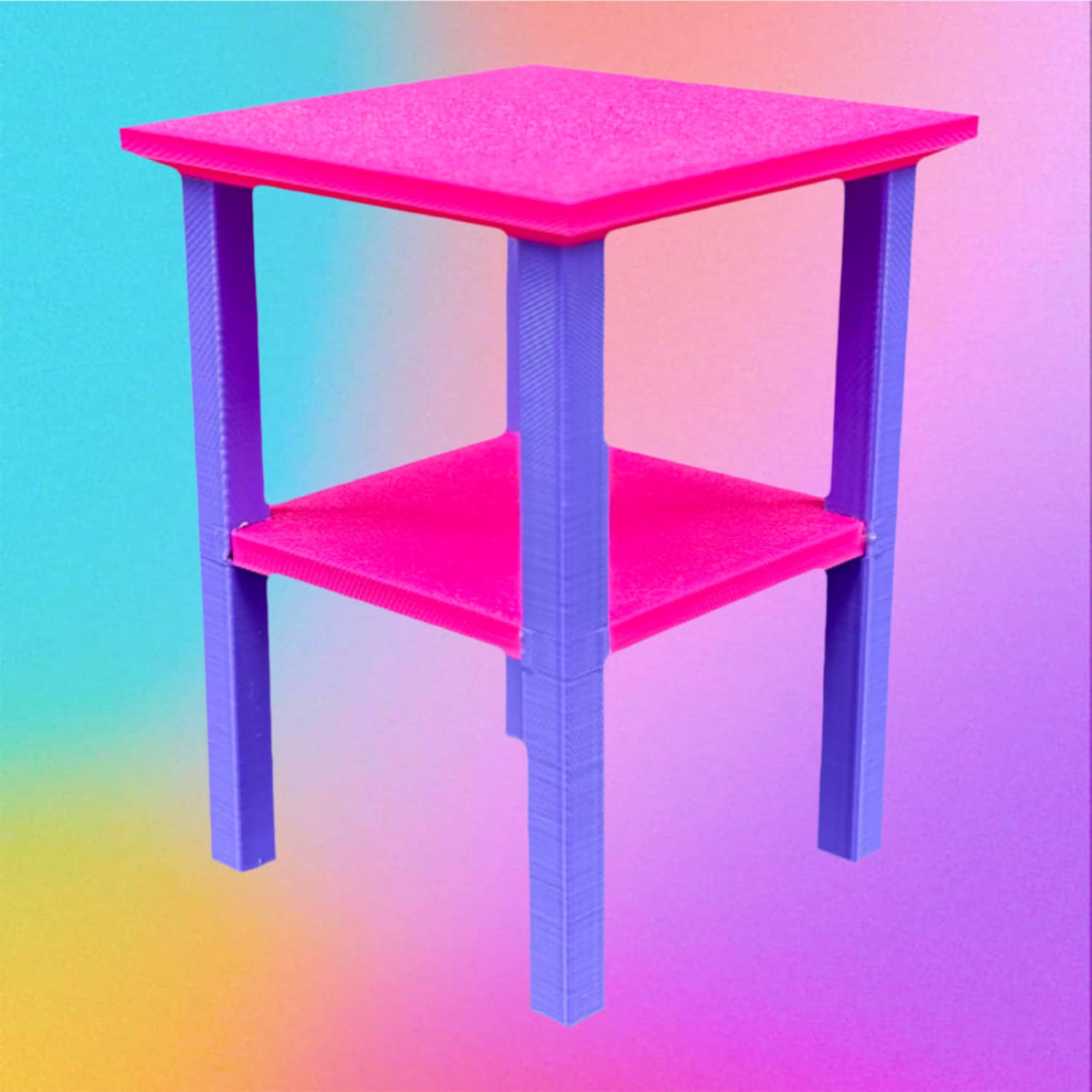 The table shelves are printed in one color and the legs are printed in a second color to create a two-tone, color-blocked effect.
