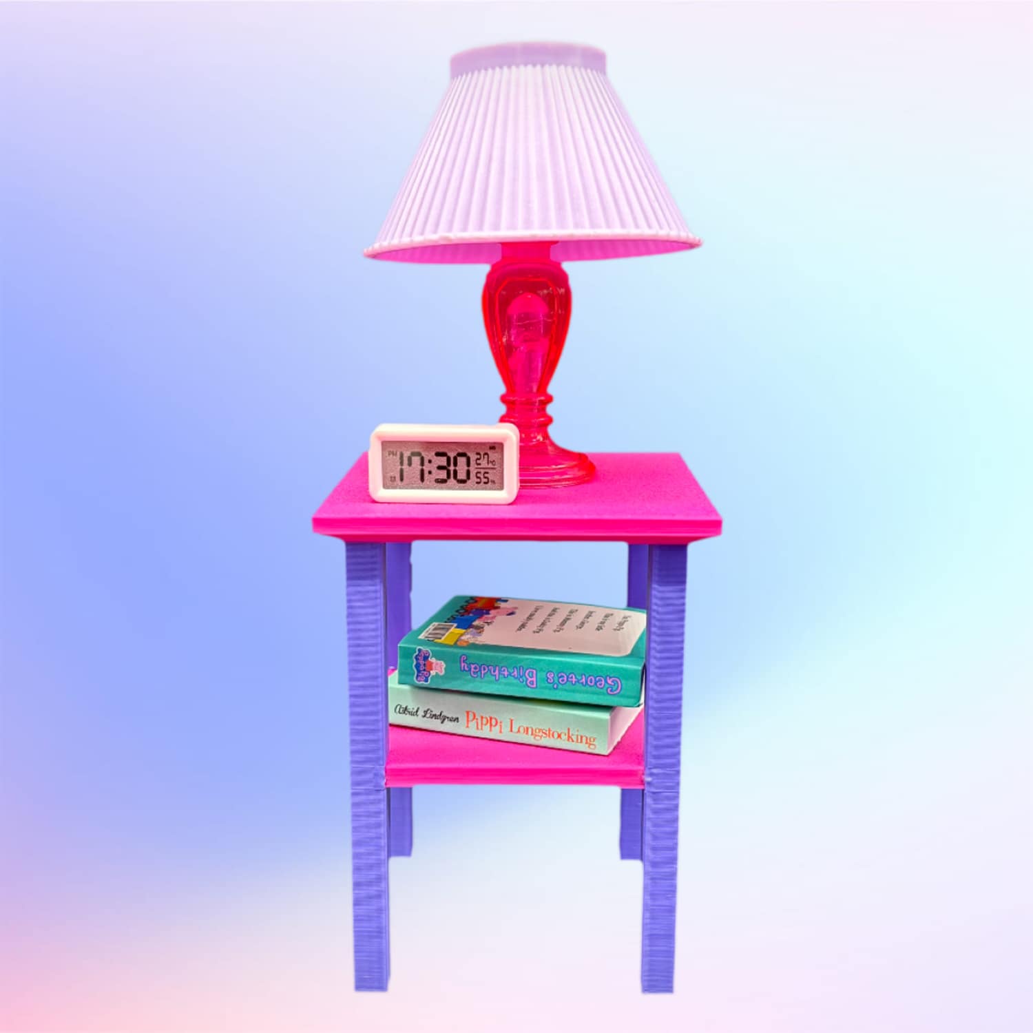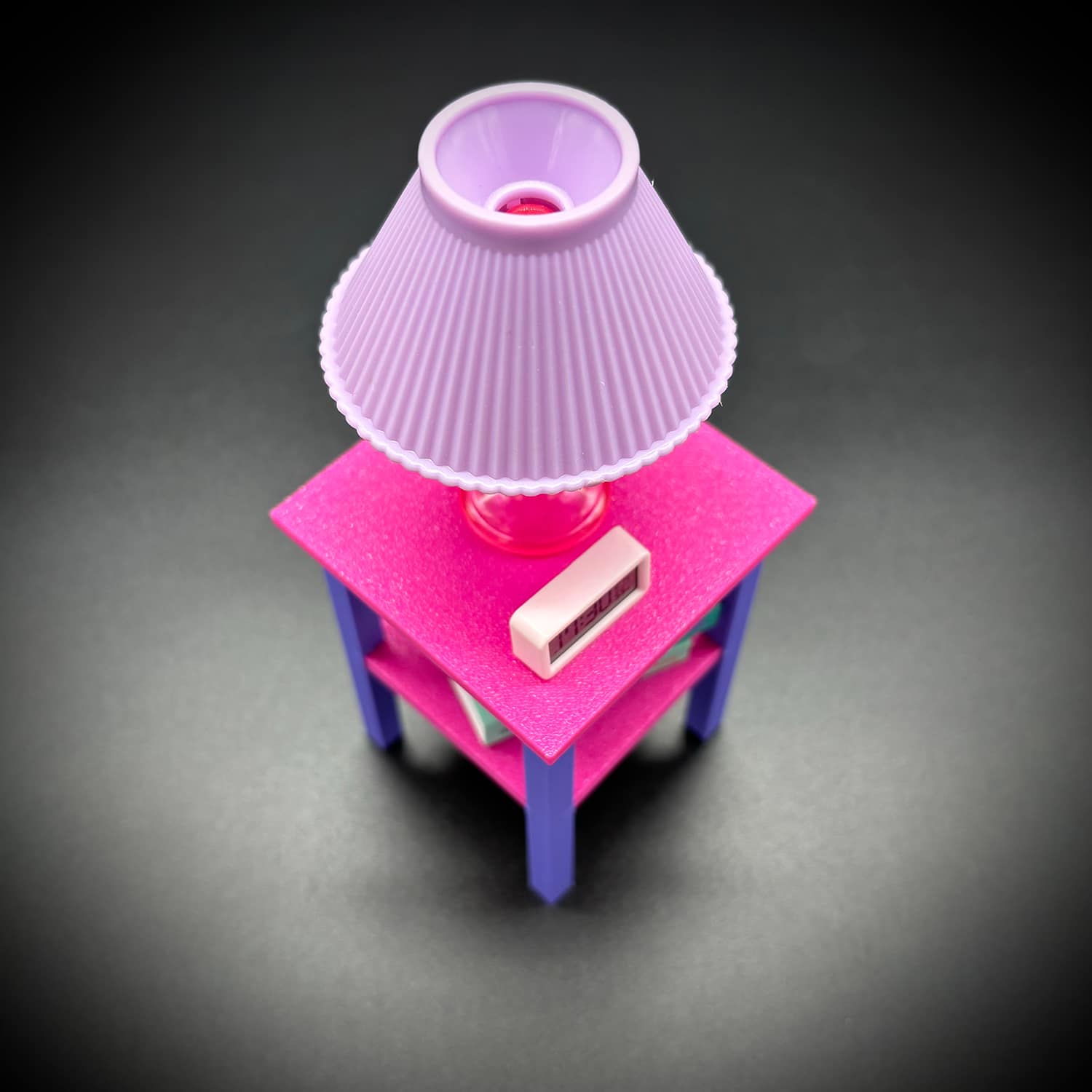 This square two color table 1:6 scale, sized for 11–12 inch fashion dolls and Barbie-scale dollhouses. It has a square top with a matching square footprint for a simple, contemporary profile. Solid top surface with a full lower shelf, ideal as an end table, nightstand, or display stand for mini books, flowers, or accessories.